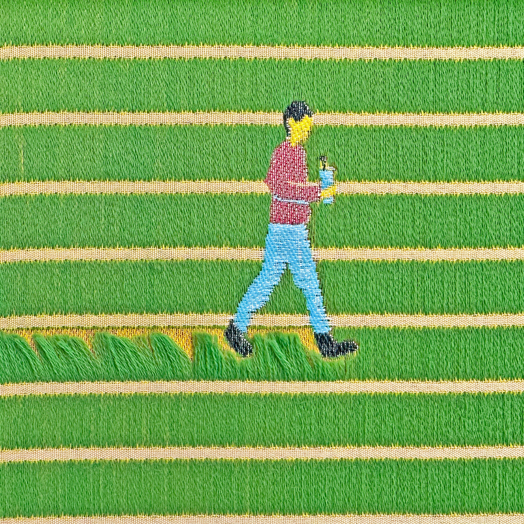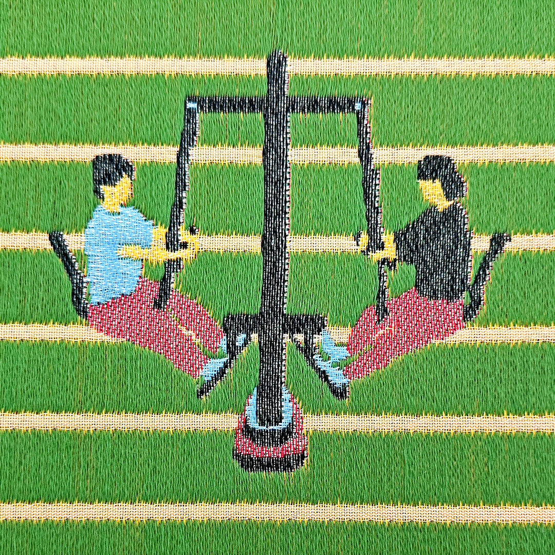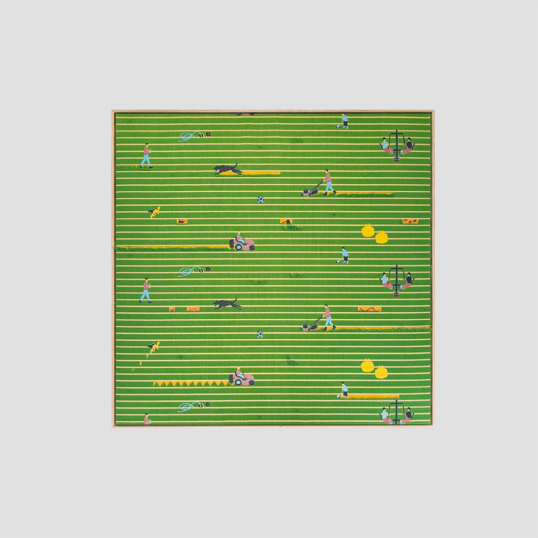 “New friends came to SHIBA’s lawn from Seoul. I was impressed by the way people in hanbok walked through Gyeongbokgung Palace, blending naturally with the modern city. I also loved the outdoor exercise equipment I found while walking around—though I didn’t dare to try the inversion table. I remember the stray cats, too. I stitched these moments into the fabric, and each time I cut the threads, the memories came back again.”