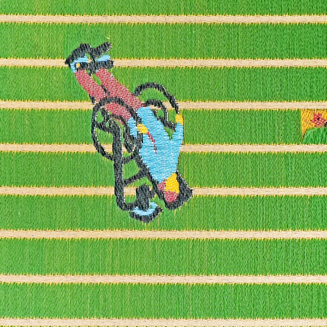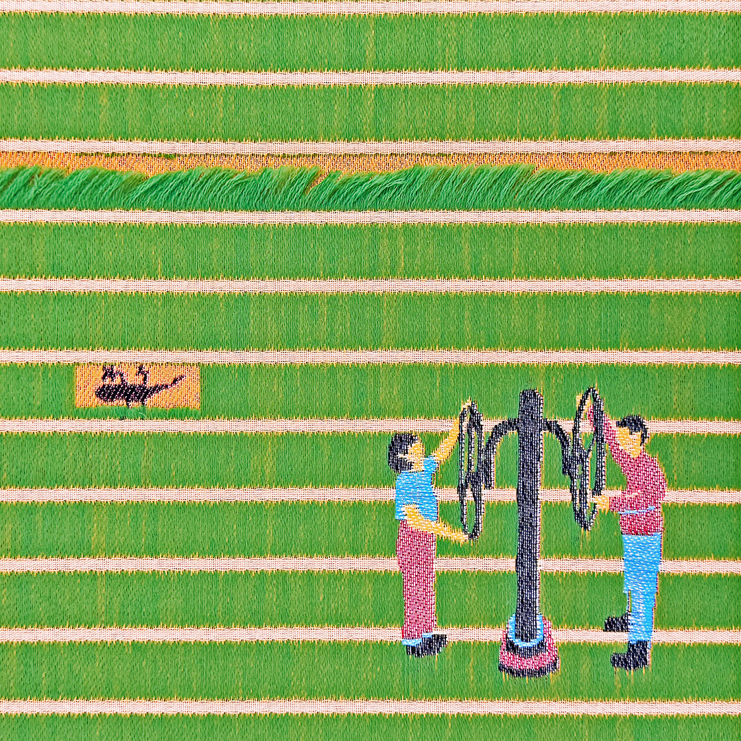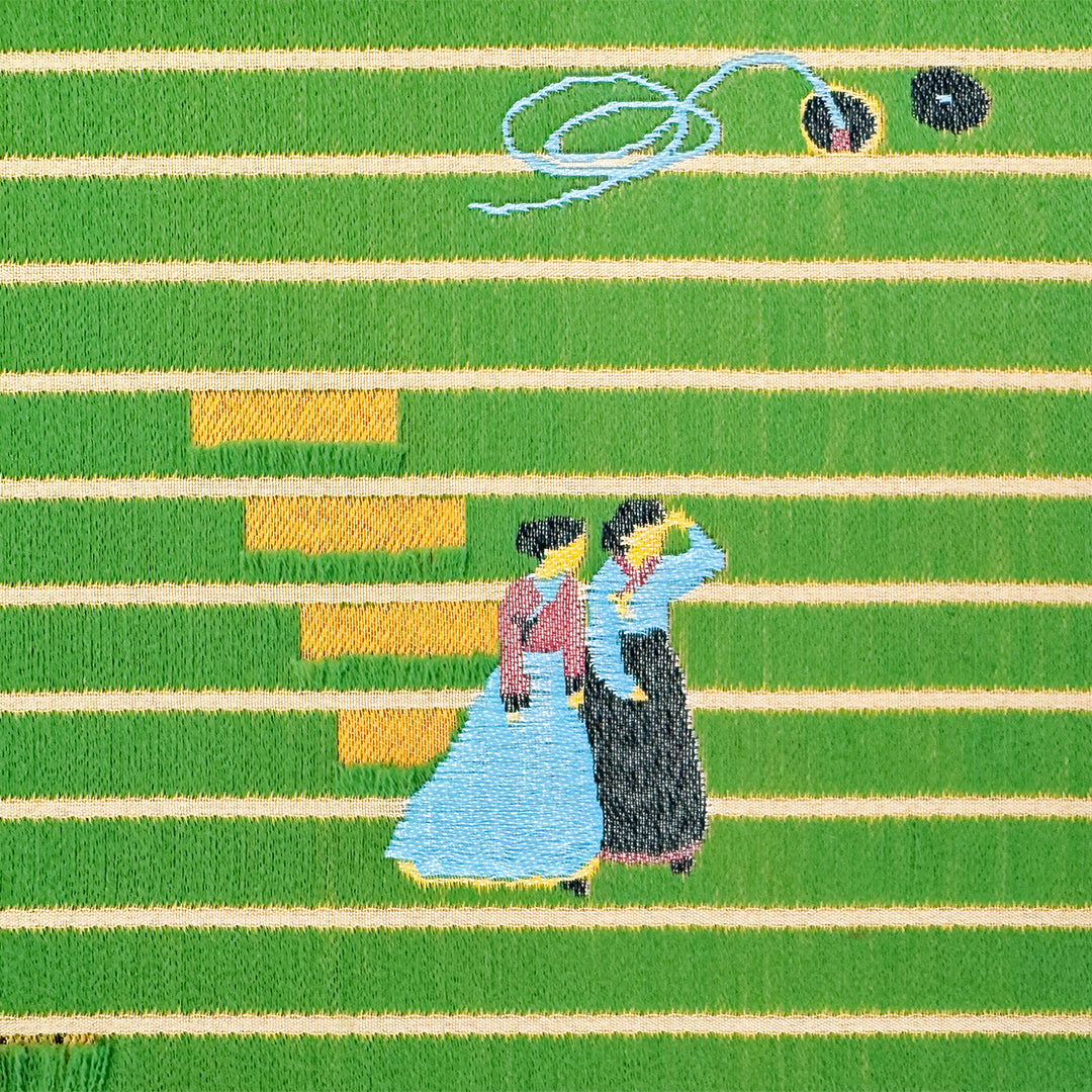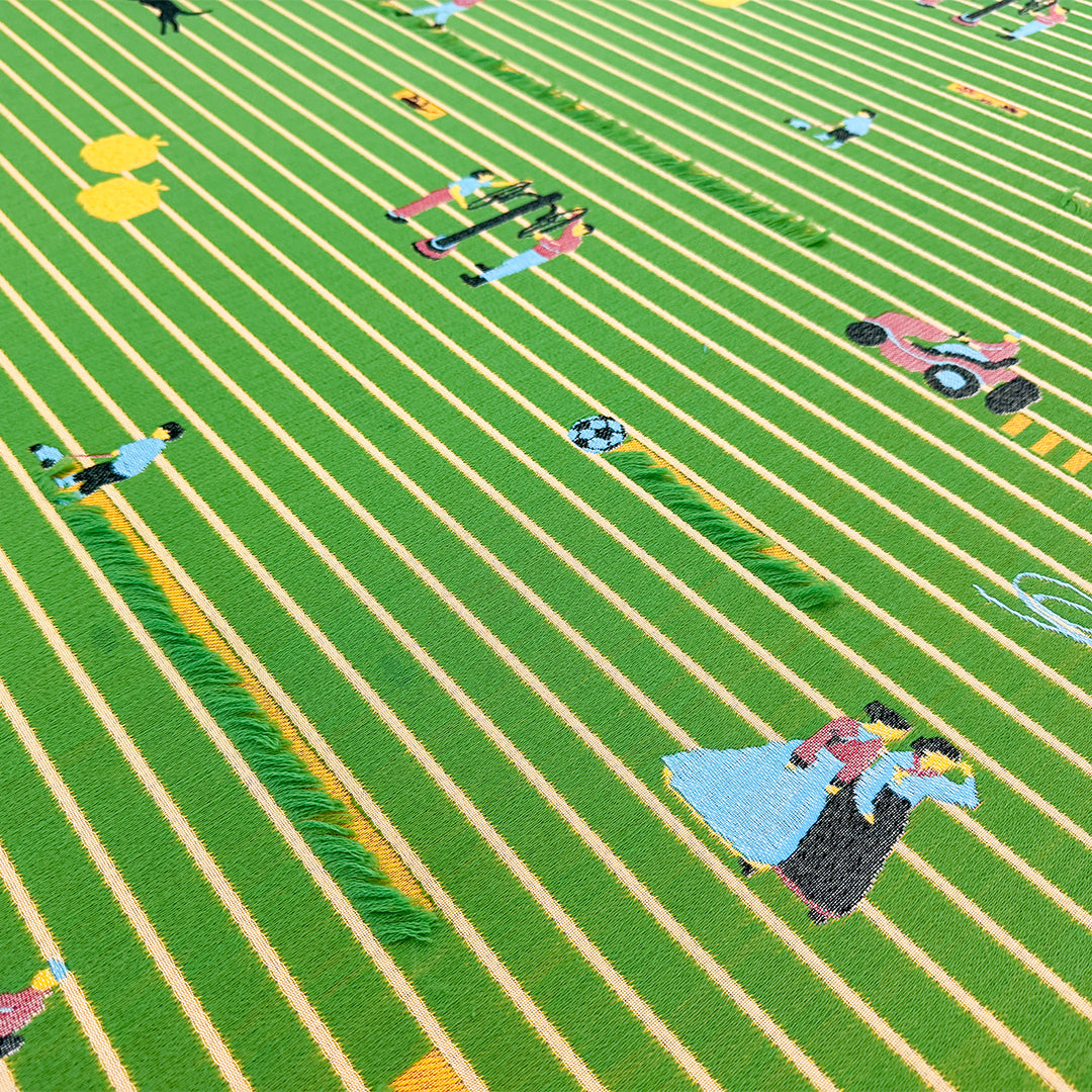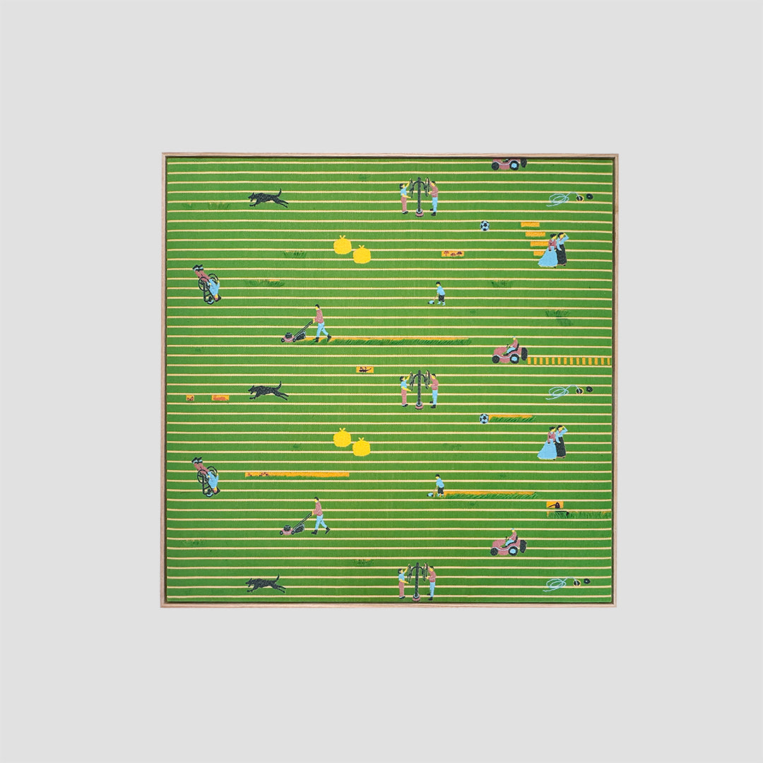 “New friends came to SHIBA’s lawn from Seoul. I was impressed by the way people in hanbok walked through Gyeongbokgung Palace, blending naturally with the modern city. I also loved the outdoor exercise equipment I found while walking around—though I didn’t dare to try the inversion table. I remember the stray cats, too. I stitched these moments into the fabric, and each time I cut the threads, the memories came back again.”